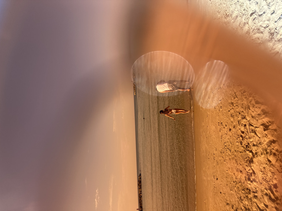 The image depicts a beach scene in Tel Aviv, Israel, under a sky exhibiting a gradient from light orange-peach on the left to dark purple-grey on the right. Sparse clouds are visible in the upper left. The Mediterranean Sea is calm, with gentle ripples, and features multiple rock breakwaters extending from the shoreline, one on the left bearing a small red structure. Two individuals are positioned at the water's edge. A female, viewed from behind, wearing a light-colored two-piece swimsuit, walks into the shallow water on the left. To her right, a male, also viewed from behind, wearing a white t-shirt and light shorts, is bent over at the waterline, appearing to interact with the sand or water. Both individuals have their feet in the water, which is clear enough to reveal the sandy bottom. The sandy beach in the foreground shows various footprints. A significant portion of the image, particularly the central and right areas, is affected by prominent photographic lens flares or reflections, manifesting as bright, semi-transparent circular and linear orange-white light artifacts. These artifacts partially obscure the sky, sea, beach, and the male figure on the right.