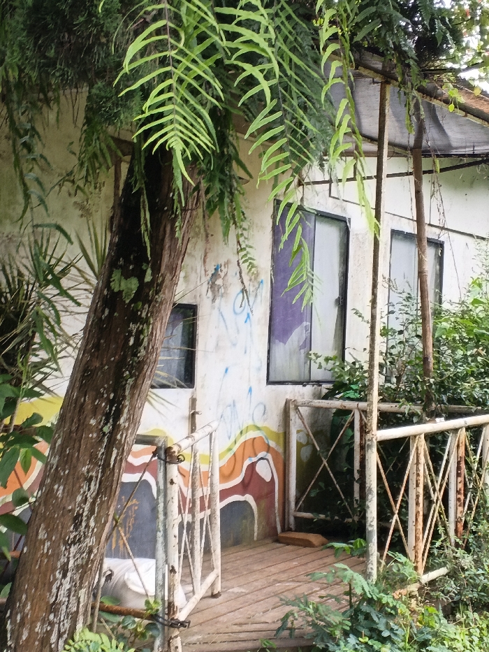 The image depicts a partial exterior view of an aged, single-story building in an overgrown environment, location Unknown, Unknown. The building's light-colored walls are stained and marked with blue graffiti text and an abstract mural featuring orange, yellow, and brown wave-like patterns along the lower section. Three dark-framed windows are visible: one small rectangular window on the left and two larger vertical rectangular windows to the right, with the glass showing a reflective or obscured quality, including a purple tint in one pane. A rustic wooden deck with weathered planks extends from the building, bordered by an off-white, rusted metal railing exhibiting a criss-cross design. A section of the railing on the left functions as a gate, secured near a prominent, thick-trunked tree with textured bark, positioned in the foreground and leaning towards the structure. Dense green fern fronds hang from above, partially obscuring the upper portion of the building and the tree. Numerous green bushes and plants proliferate around the deck and the building's base. A corrugated or tarp-like roof structure supported by rusty metal poles is visible in the upper right. No persons are present. A white, rounded object and a small, brown, rectangular object are situated on the wooden deck.