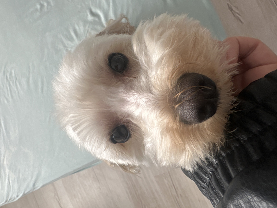 The scene is set indoors within the city of Sestrimo, Bulgaria. A small domestic dog with cream and tan fluffy fur is captured in a close-up, head-on view. Its dark, round eyes directly face the viewer, and its prominent black, textured nose is centrally positioned. A human hand, partially visible on the lower left, wears a black, textured garment, possibly leather, and supports the dog's head. The immediate background comprises a light blue, wrinkled fabric surface in the upper right, and a light-colored wooden or laminate floor in the upper left.