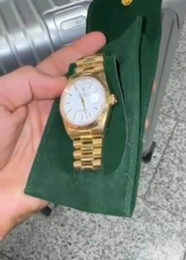 A hand holds a gold-colored Rolex watch in a dark green velvet pouch, the watch face is white. The watch has a date window. The pouch has a gold snap. In the background, a silver suitcase sits on a gray tiled floor.