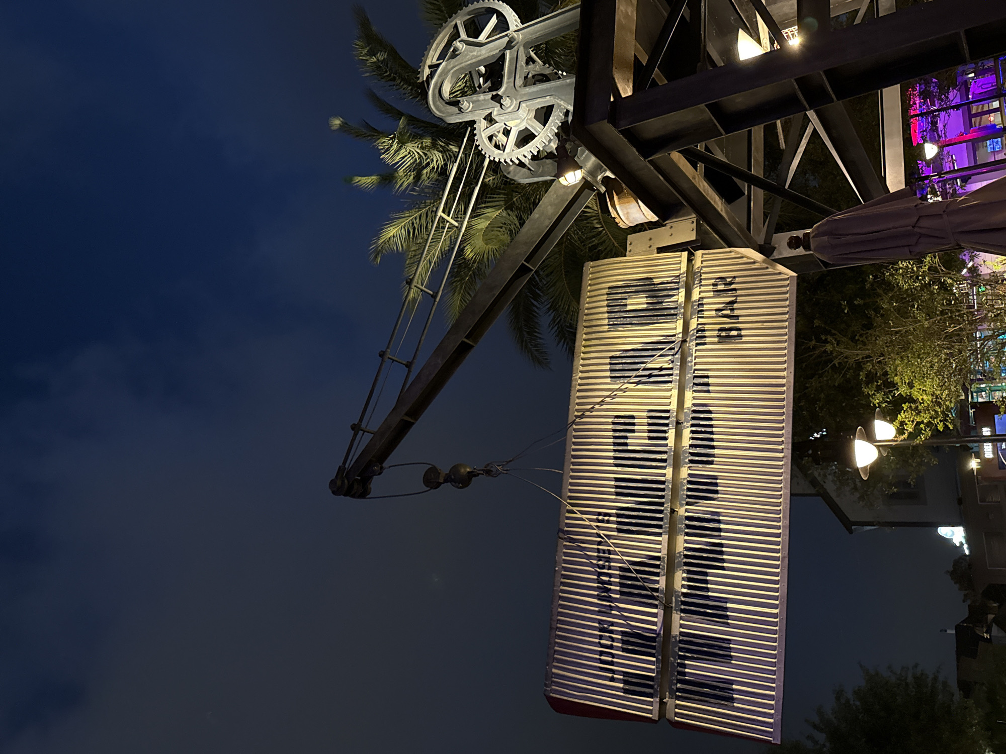 The photograph depicts a nighttime scene in Lake Buena Vista, United States, featuring a metal structure resembling a crane arm. At the top of the crane arm is a large gear mechanism, seemingly part of the decorative structure. Suspended from the crane arm is a rectangular sign with horizontal slats and the word "BAR" painted vertically in bold, stylized font. The sign is illuminated, contrasting against the dark sky. In the background, there is a view of buildings with lit windows and street lamps. Green foliage from trees and plants is visible, suggesting an outdoor environment. The sky is a deep blue, indicating it's after dusk.