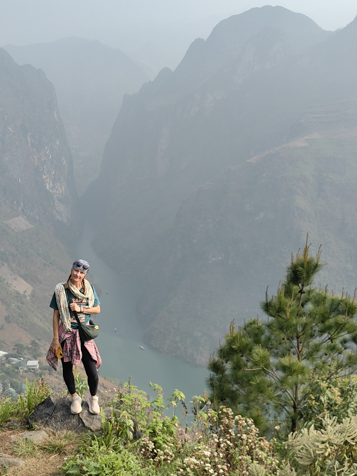 A woman stands on a rocky outcrop overlooking a river valley in Mèo Vạc Commune, Vietnam. The woman wears a t-shirt, black leggings, and white sneakers; she has a plaid shirt tied around her waist, a patterned scarf around her neck, and a head covering. She is holding a yellow object (likely a phone) in her left hand. A small bag is slung across her body. Behind her, the landscape is dominated by a deep river valley carved between steep, misty mountains. The river is visible as a green strip winding through the valley floor. Some vegetation, including a pine tree, is visible in the foreground to the right. A few houses are visible in the distance to the left. The sky is overcast, contributing to a hazy atmosphere.