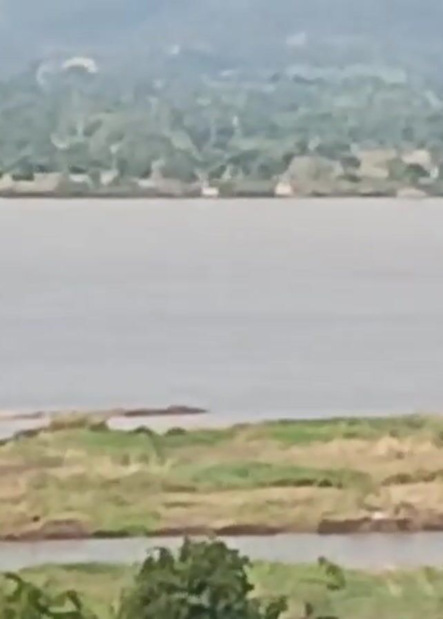 The scene shows a wide river with a strip of land covered in yellow and green vegetation in the foreground