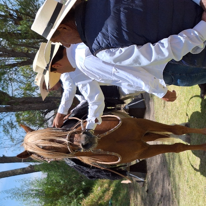 Three men in white long-sleeved shirts and sombreros stand near a brown horse. The first man wears a dark blue vest and jeans, while the others wear dark pants. The horse has a decorative bridle and long mane. They are standing on green grass in an outdoor setting with trees in the background. The men appear to be getting ready to ride the horse.