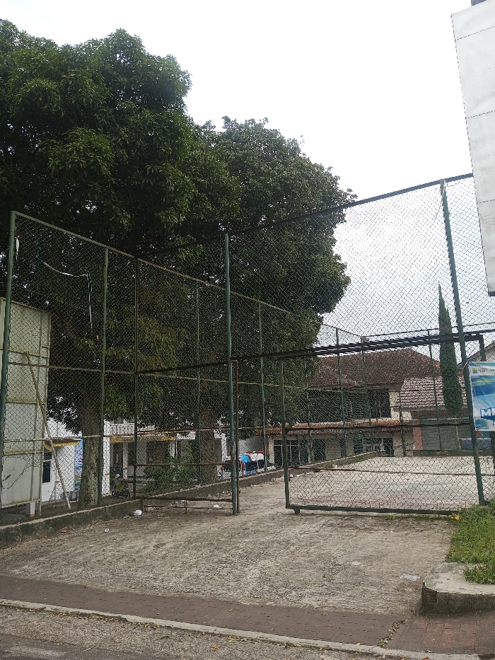 A chain-link fence encloses a concrete or asphalt area with some litter scattered around. Behind the fence, there's a building with a tiled roof and a tree. A white building is visible on the left side. The sky is overcast. The composition is framed with the fence dominating the foreground. A tall thin tree is on the right of the background.