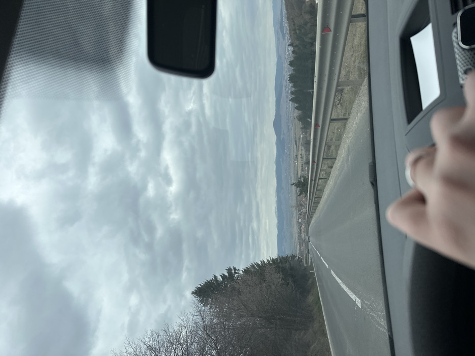 The image depicts a view from the interior of a vehicle, looking forward through the windshield onto a rural road and distant landscape under an overcast sky. In the immediate foreground, the top of a dashboard is visible, with a hand wearing a ring partially gripping the steering wheel on the lower left. A rectangular compartment on the dashboard contains a white sheet of paper, and a textured black object is visible to its right. A rearview mirror hangs from the upper center of the windshield. The main subject is a two-lane asphalt road extending into the distance, with a solid white line marking the left edge and a dashed white line indicating the center. The road appears to descend and curve gently to the right. On the left side of the road, a dense treeline composed of leafless deciduous trees and scattered conifers runs alongside. On the right, a metal guardrail, equipped with multiple red triangular reflectors, separates the road from a downward sloping embankment. Vehicles are faintly visible in the far distance on the road. Beyond the immediate roadside, a wide valley unfolds, containing scattered buildings and trees consistent with a small town or village. The horizon is dominated by a range of hills and mountains, some exhibiting patches of snow. The sky is entirely covered with dense, grey clouds, indicating an overcast condition. The environmental conditions suggest a cold season, likely winter or early spring, due to the bare trees and snow-capped peaks. The location is Unknown, Unknown.