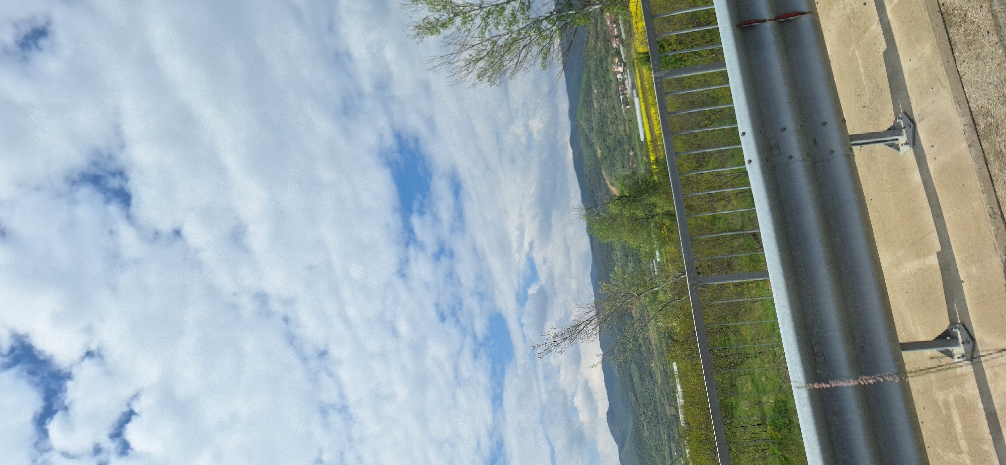 landscape from what appears to be a roadside view near Mikrevo, Bulgaria. A metal guardrail is prominently displayed in the foreground, attached to a concrete barrier. Beyond the guardrail, there is a lush green landscape, possibly a meadow or hillside, interspersed with yellow vegetation, perhaps wildflowers. The background features a mountain range and a village with buildings visible within the greenery. Above, the sky is filled with white clouds against a blue backdrop.