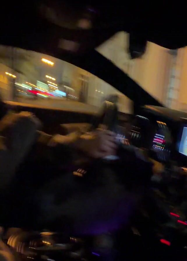 two women driving at night. The driver appears to be focused on the road while the passenger films the interior of the car and then herself. The interior of the car is illuminated with purple lighting. The dashboard displays information about the car. The car drives down a street with street lights and buildings visible. There is a pedestrian crossing sign in the distance. The video ends with a close up of the passenger's face.