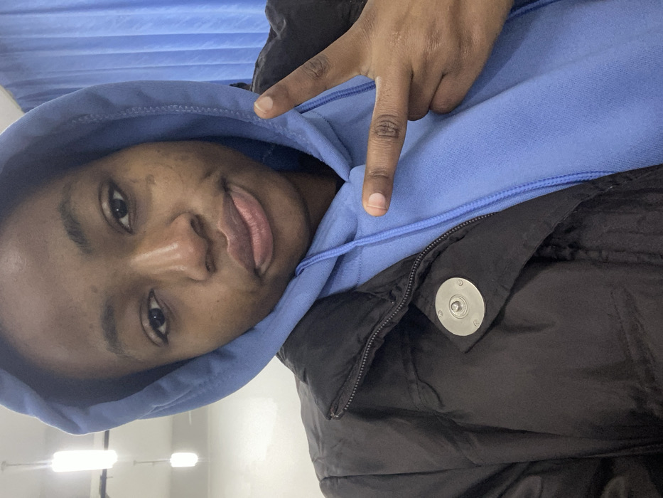 A person with brown skin is wearing a blue hooded sweatshirt and a black jacket. They are looking directly at the camera, with their tongue slightly visible. The person is making a "V" sign with their hand near their head. The background appears to be a brightly lit indoor space. The image has been rotated.