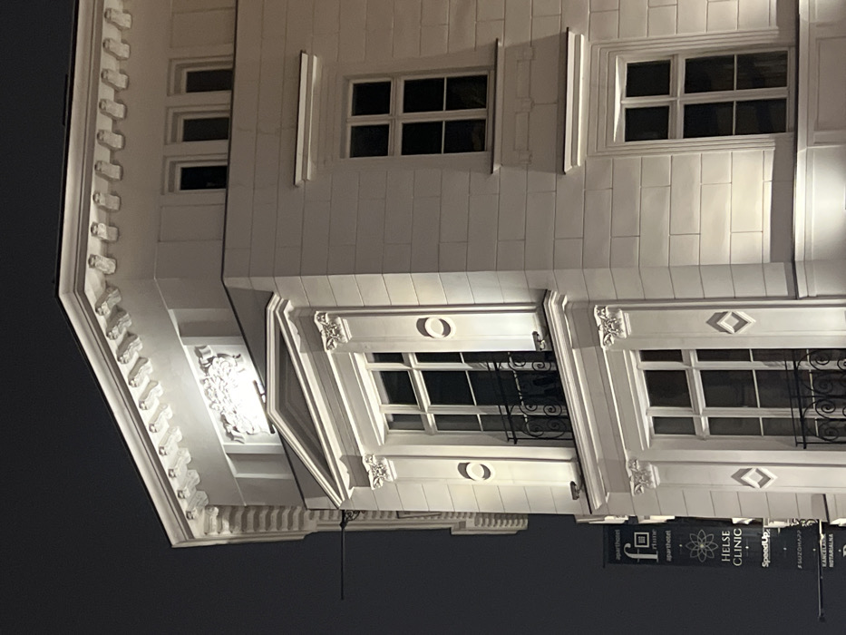 A white building facade fills the frame, illuminated at night