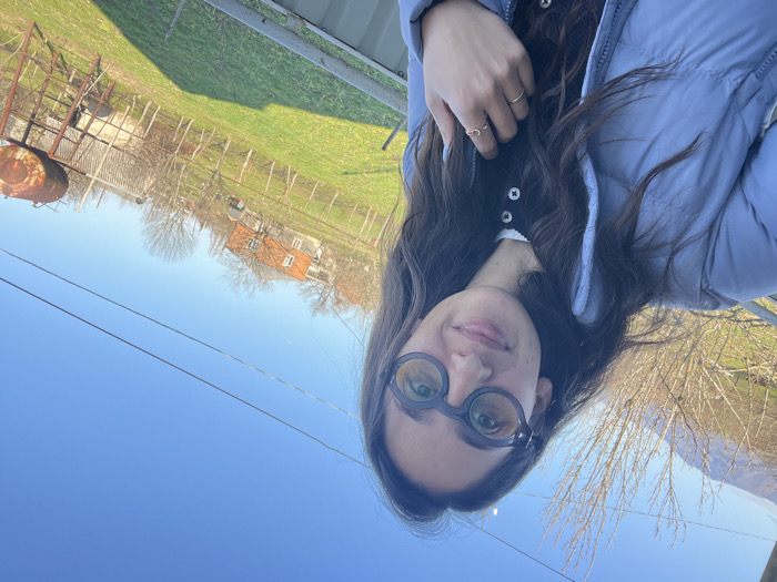 The image displays a female individual taking a selfie outdoors in Zeda Sakara, Georgia, under a clear, bright blue sky. The subject, positioned in the upper left quadrant, has long, dark, wavy hair and wears dark-rimmed, circular glasses with yellow-tinted lenses. She is dressed in a light blue puffer jacket over a dark top with visible buttons. Her right hand, positioned near her chest, shows a simple gold band on her ring finger and a gold ring featuring a crescent moon and star motif on her middle finger. The background reveals a rural or semi-rural environment. A vibrant green grassy field occupies the mid-ground, interspersed with bare deciduous trees and what appears to be a vineyard indicated by rows of vertical stakes or trellises. Several structures are visible, including a two-story house with a reddish-brown roof and light-colored walls, situated centrally in the mid-right. Further to the right, a rusty, cylindrical metal water tank is elevated on a metal stand. Utility wires traverse the upper portion of the frame. In the far left background, distant mountains are faintly visible beneath the clear sky, partially obscured by bare trees. A metallic edge, likely a railing or balcony, is present in the immediate foreground at the bottom.