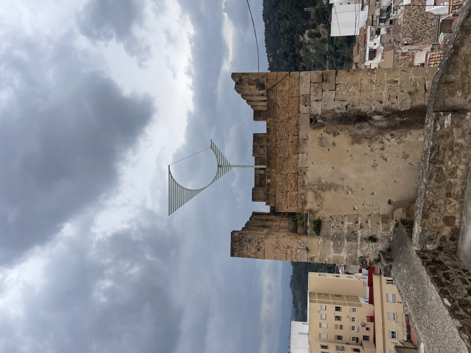 A wide shot depicts a weathered stone fortification, identified as part of the castle in Buñol, Spain, under an overcast sky