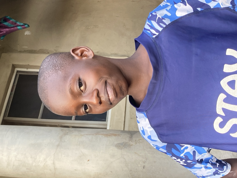 A young man with a shaved head smiles at the camera. He's wearing a navy blue shirt with blue and white camouflage sleeves, and a portion of the word "STAY" is visible on his shirt. He stands outside a building with a window and a concrete pillar. A small piece of colorful fabric hangs from the upper left corner of the image.