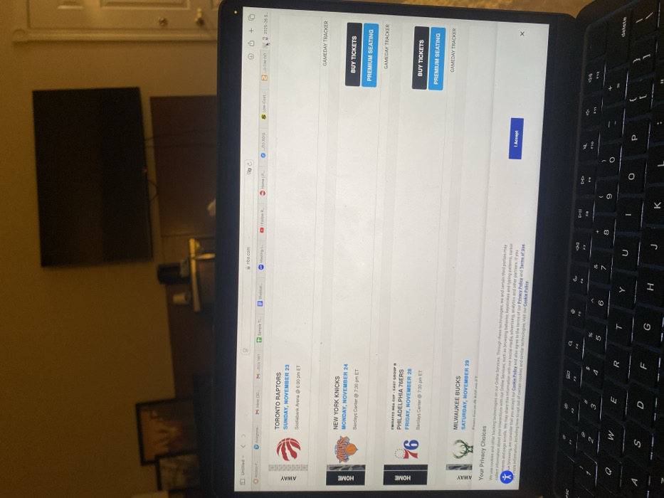 This image, taken in the City of Albany, United States, captures a close-up, angled view of an open dark-colored laptop displaying the NBA.com website, with a dimly lit interior room visible in the background. The laptop screen shows a list of upcoming NBA games, including "TORONTO RAPTORS" on Sunday, November 23, "NEW YORK KNICKS" on Monday, November 24 at Barclays Center, "PHILADELPHIA 76ERS" (Emirates NBA Cup) on Friday, November 28 at Barclays Center, and "MILWAUKEE BUCKS" on Saturday, November 29. "BUY TICKETS" and "PREMIUM SEATING" buttons are visible next to the Knicks and 76ers listings. A "Your Privacy Choices" cookie consent banner is displayed at the bottom of the screen with an "I Accept" button. The laptop's illuminated keyboard is partially visible at the bottom of the frame. In the background, a large, dark flat-screen television is mounted on a light-colored wall. Below the television, a dark brown furniture piece holds an indistinct object. To the left, two framed pictures hang on the wall, and to the right, a light-colored door is partially open. No individuals are visible in the scene.