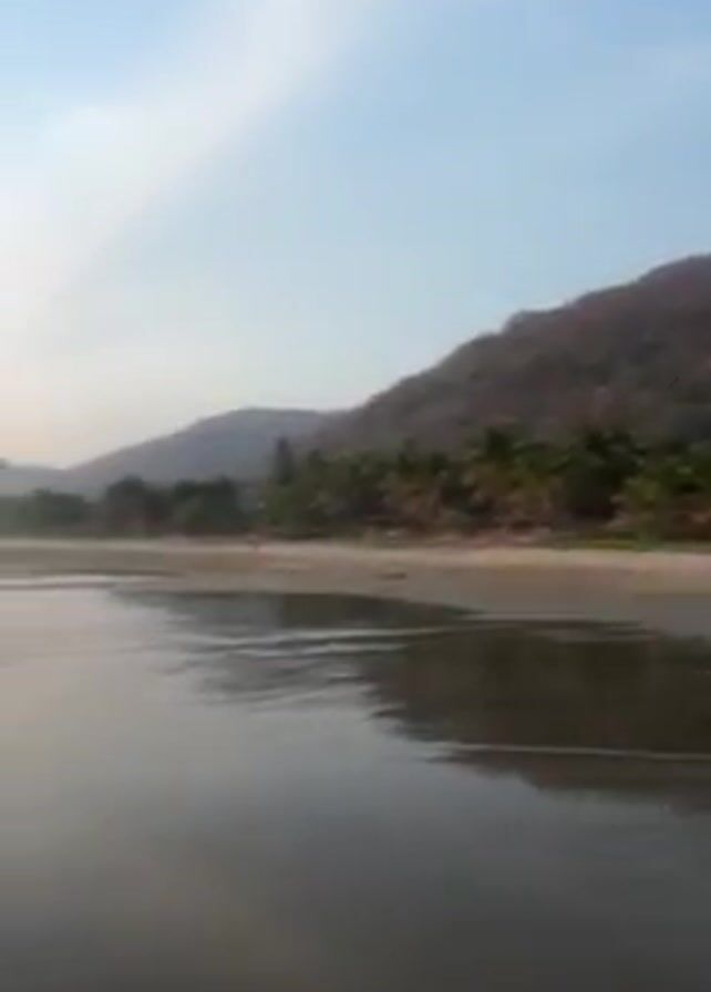 beach landscape, starting with a view of a sandy beach with a mountain range in the background