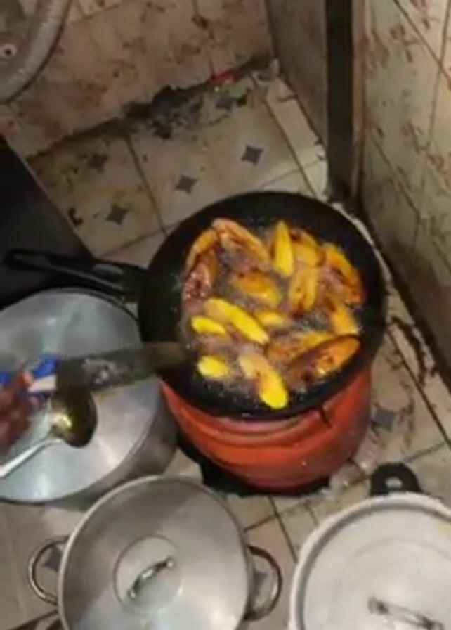 person frying plantains in a kitchen. The plantains are being fried in a black pan on a small orange gas stove. The person is using a spatula with a blue handle to turn the plantains. There are three large pots with lids on the floor around the stove. The kitchen floor is tiled in a pattern of white, grey, and blue tiles. The walls are tiled with a floral pattern. The person is also seen holding a smartphone.
