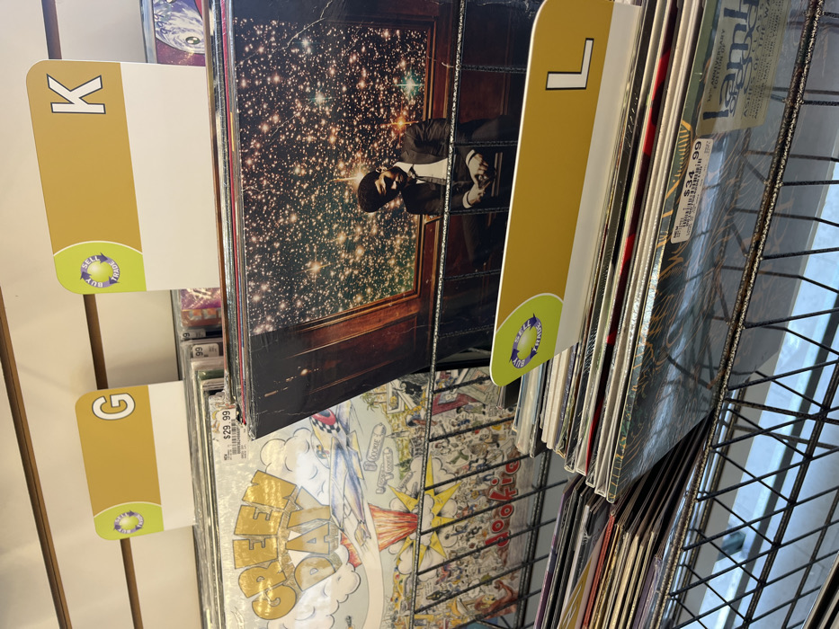 This image captures a retail display of vinyl records inside a store, presumed to be located in Edmond, United States