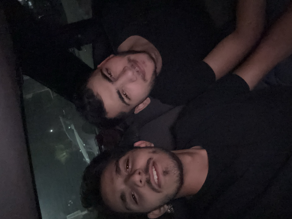 Two young adult males are photographed inside a vehicle at what appears to be night, situated in Barza Municipality, Syria. The male in the foreground, positioned slightly left of center, has dark hair, a mustache, and a short beard, wears a dark crew-neck t-shirt, and exhibits a slight smile with an earring visible in his left ear. The second male, seated behind and to the right of the first, also has dark hair and facial stubble, wears a dark t-shirt, and looks towards the camera with a subtle smile. The vehicle's dark interior elements are visible, including the roofline. Through the window in the background, a blurred nighttime urban scene is discernible, featuring distant lights and the indistinct outline of another vehicle. The overall lighting is dim, consistent with an evening or nighttime setting.