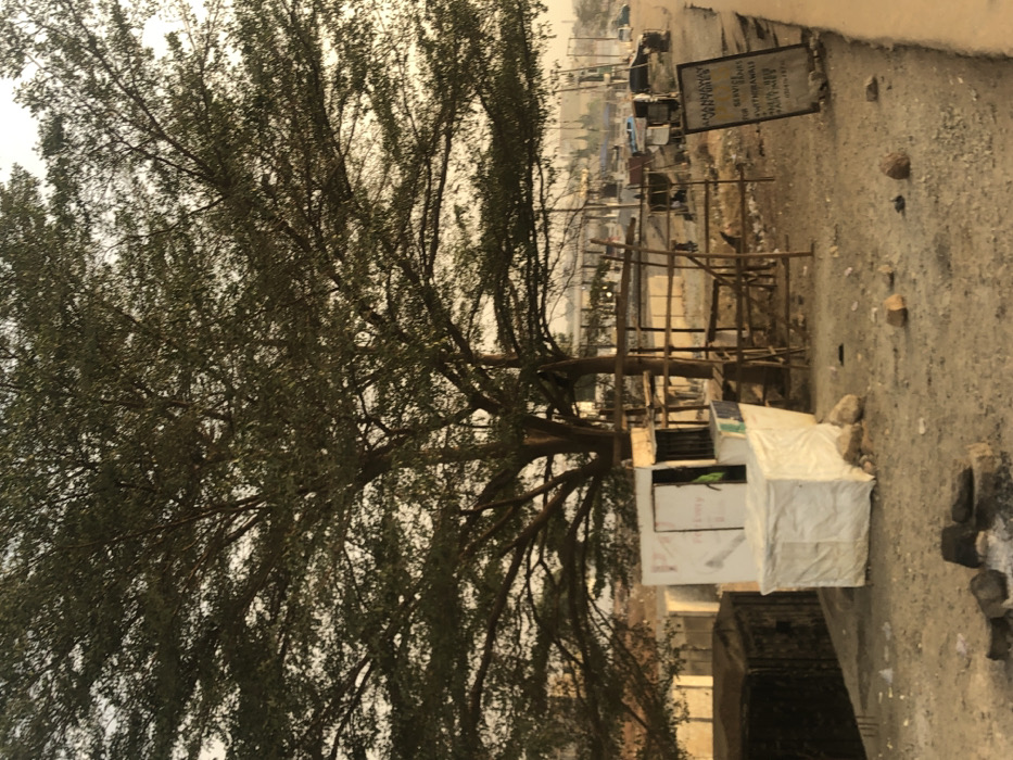A large tree dominates the left side of the frame. Branches extend toward a makeshift shelter constructed of white plastic and cardboard, situated near a rickety wooden structure. A sign bearing the name "Rannanjay Ventures" is visible on the right. The ground is dirt. Faint buildings are on the horizon under a hazy sky.