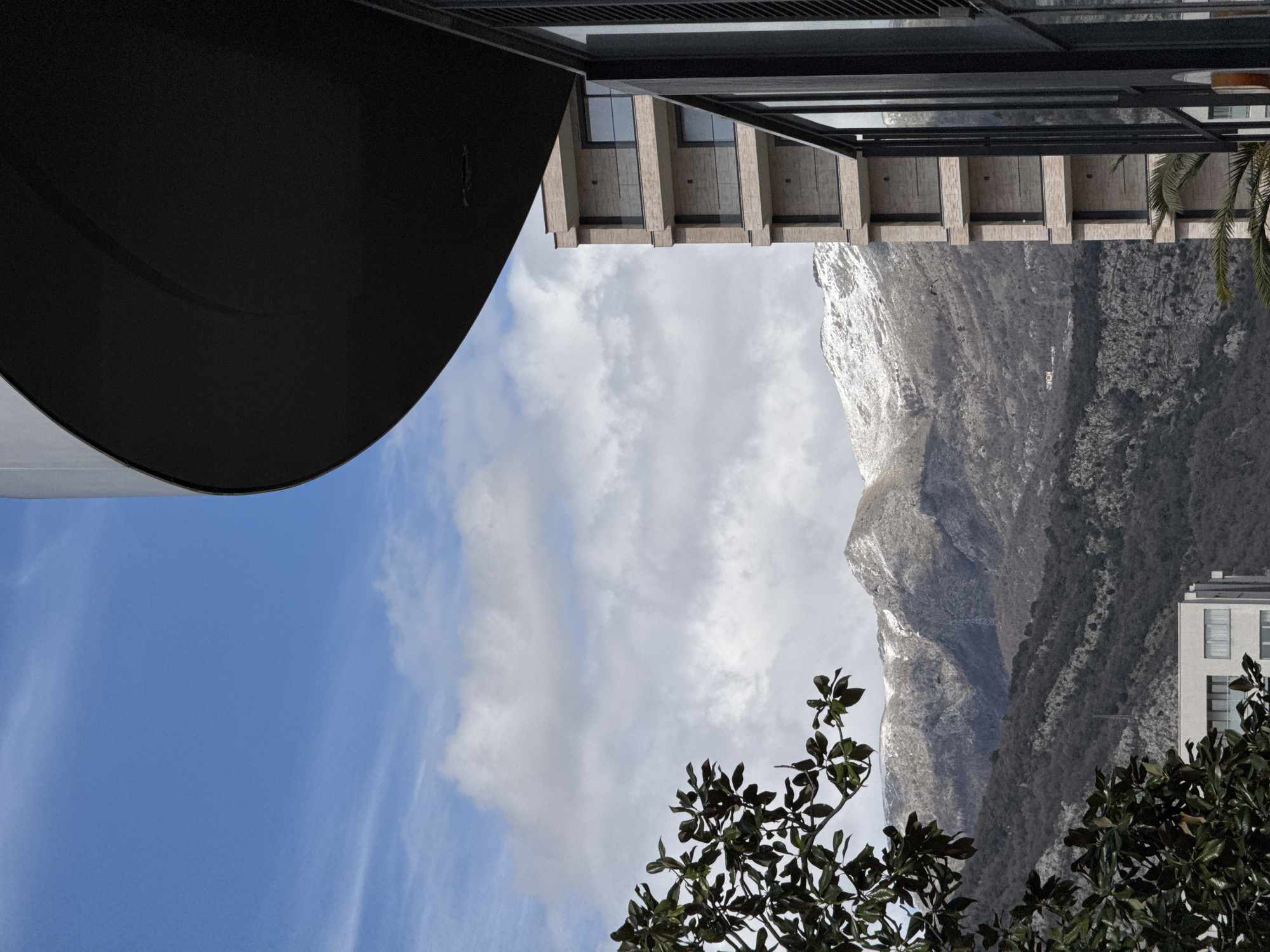 view in Budva, Montenegro, looking up at the mountains. Buildings are visible on either side of the frame. The left side shows a structure with a curved, dark awning. The right side shows a modern building with recessed balconies and a palm tree. In the center, a mountain range with snow on the peaks is visible against a backdrop of cloudy, blue sky. A tree is in the foreground on the right.