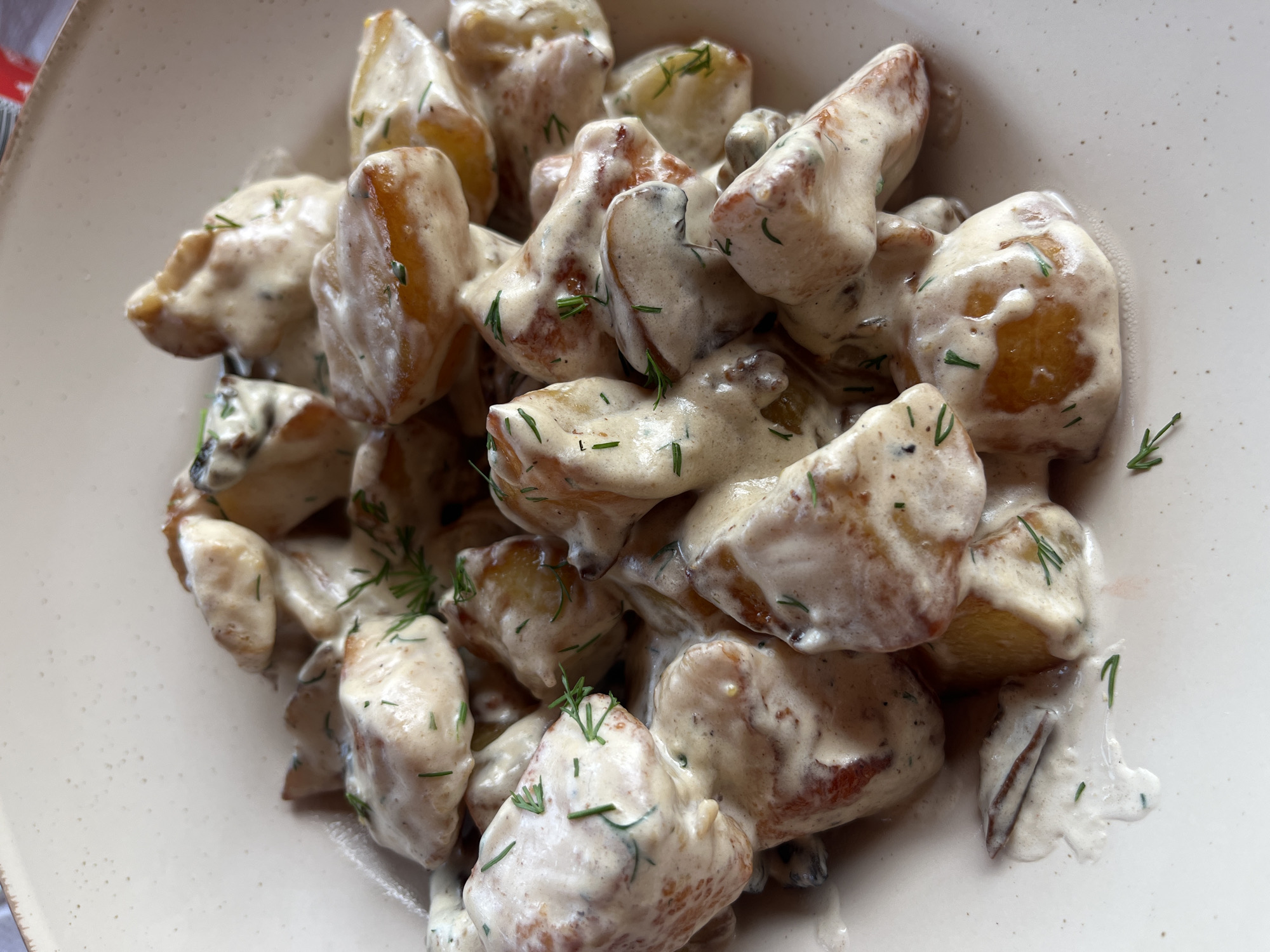 - "close-up of a white bowl filled with roasted potatoes covered in a creamy, herbed sauce, likely dill" by FM-JCVbC2, licensed under CC BY 4.0