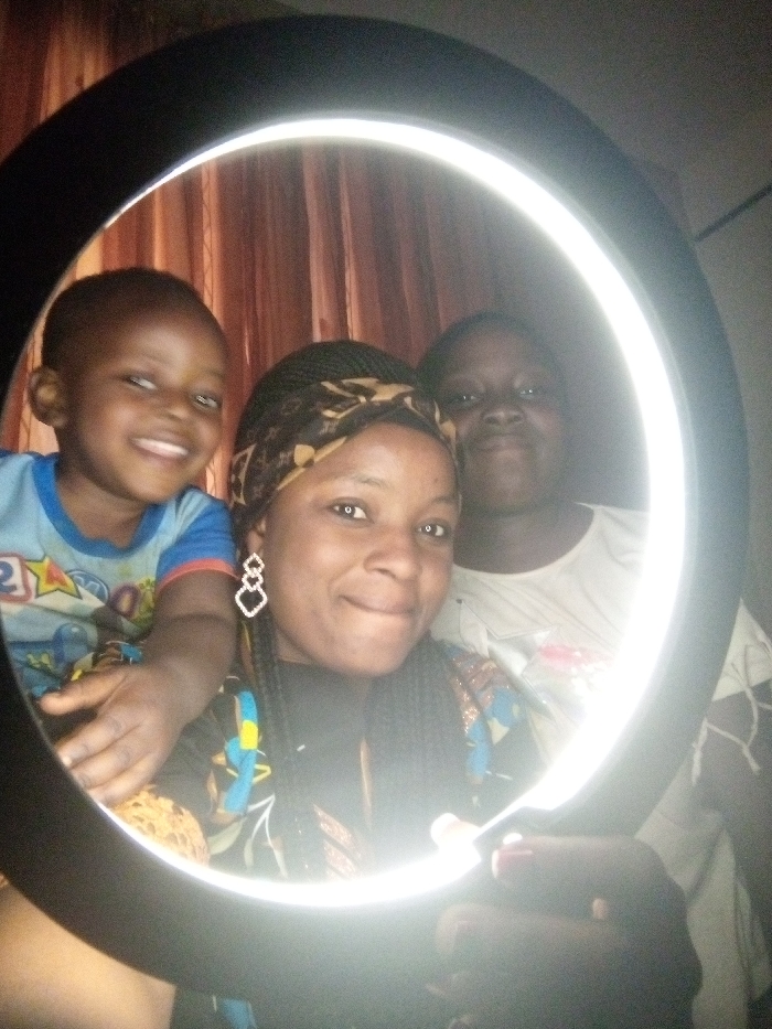 The image captures three individuals indoors in Sabon Tasha, Nigeria, illuminated by and framed within a circular, black-rimmed LED ring light. The central subject is an adult female with dark skin, wearing a patterned headwrap, braided hair, and diamond-shaped dangle earrings, with a slight smile. She holds the ring light with her right hand, visible in the lower right corner. To her left and slightly behind, a young male child with dark skin, wearing a light blue t-shirt with multi-colored designs, smiles broadly. His right hand is visible near the lower left quadrant of the ring light. To the right and behind the central female, a second adult female with dark skin is partially visible, wearing a light-colored top and exhibiting a neutral to slight smile. The background consists of reddish-brown pleated curtains.