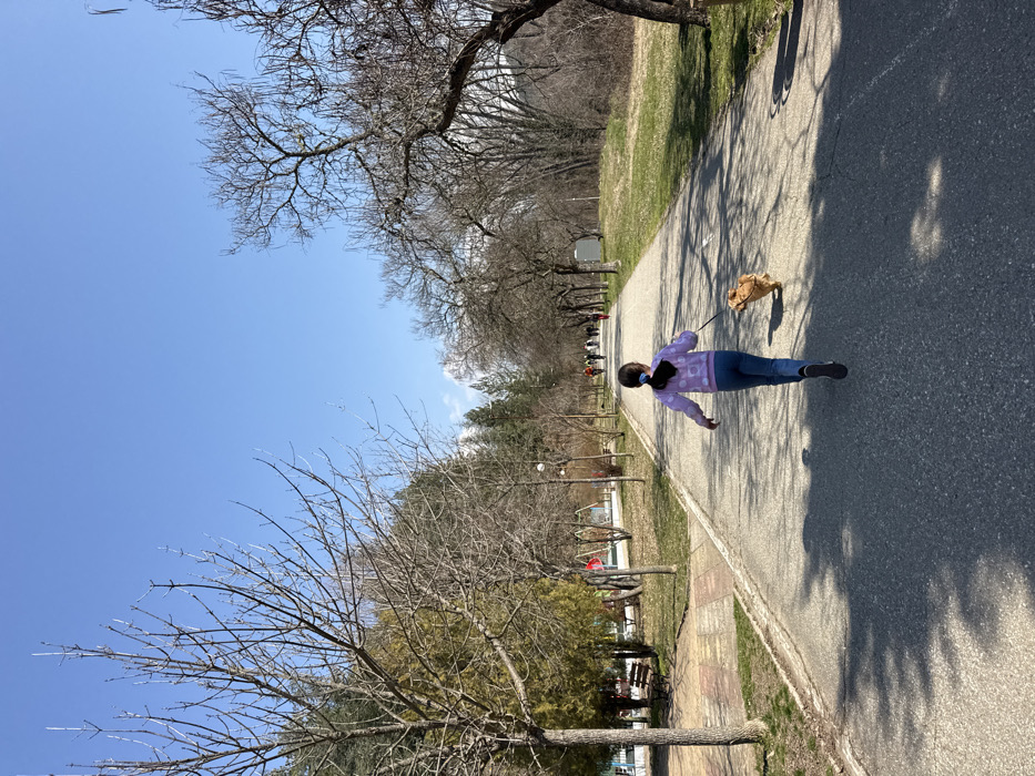 The image displays an outdoor park scene on a clear, sunny day in Blagoevgrad, Bulgaria. A paved asphalt path extends from the foreground into the background, gradually narrowing. In the midground, a juvenile female, viewed from behind, is running away from the camera, positioned slightly right of the path's center. She is dressed in a light purple long-sleeved top with white polka dots, blue jeans, and dark shoes, with her dark hair pulled back. She holds a leash in her right hand, attached to a small, light brown, fluffy canine subject running immediately to her right. The path is bordered on both sides by green grass, interspersed with numerous trees; most are deciduous and bare of leaves, indicating late winter or early spring, alongside some coniferous trees. On the left side of the path, a park area contains a wooden bench, indistinct playground structures in the distance, and multiple lampposts spaced along the edge. On the right, an elevated grassy bank with additional bare trees forms a natural boundary. In the far background, several human figures are discernible walking or cycling along the distant section of the path. The sky overhead is clear and blue with minimal cloud cover.