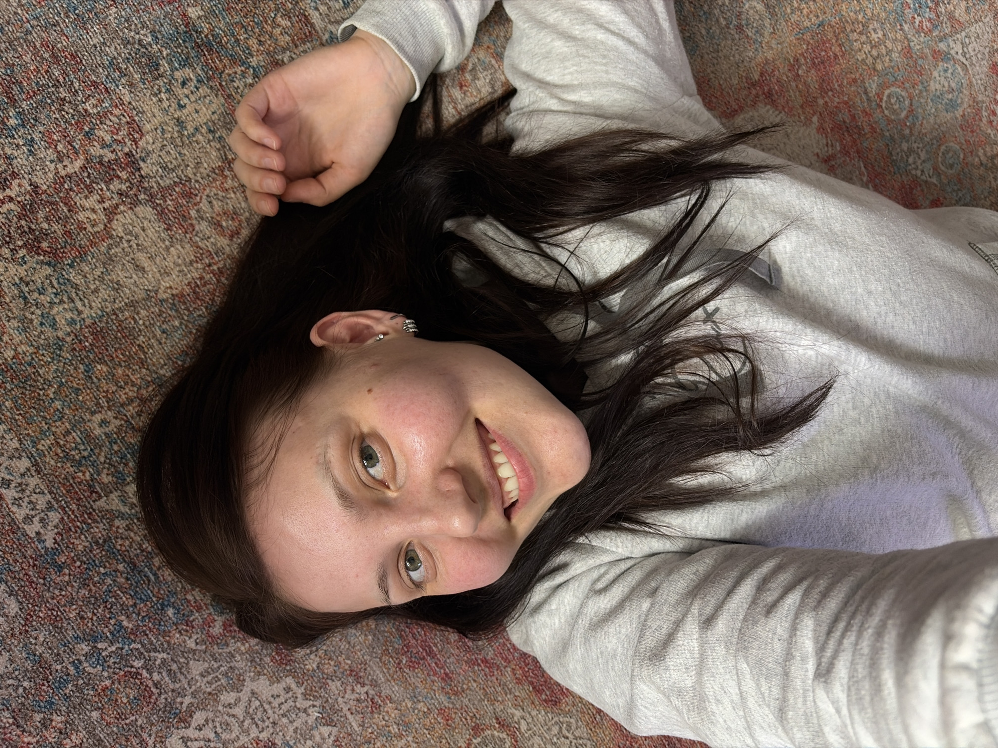 A young adult female, identified with dark brown hair and green eyes, is depicted lying supine on a patterned rug in an indoor setting in Chaikovsky, Russia. She is wearing a light grey long-sleeved top. Her head is positioned towards the bottom of the frame, and she is looking directly at the camera with a slight smile, revealing her upper teeth. Her dark hair is spread loosely around her head. The subject's left ear is visible, adorned with multiple silver-toned hoop piercings. Her left hand rests on the rug near her head. The rug features a distressed ornamental design incorporating shades of red, blue, beige, and dark brown.