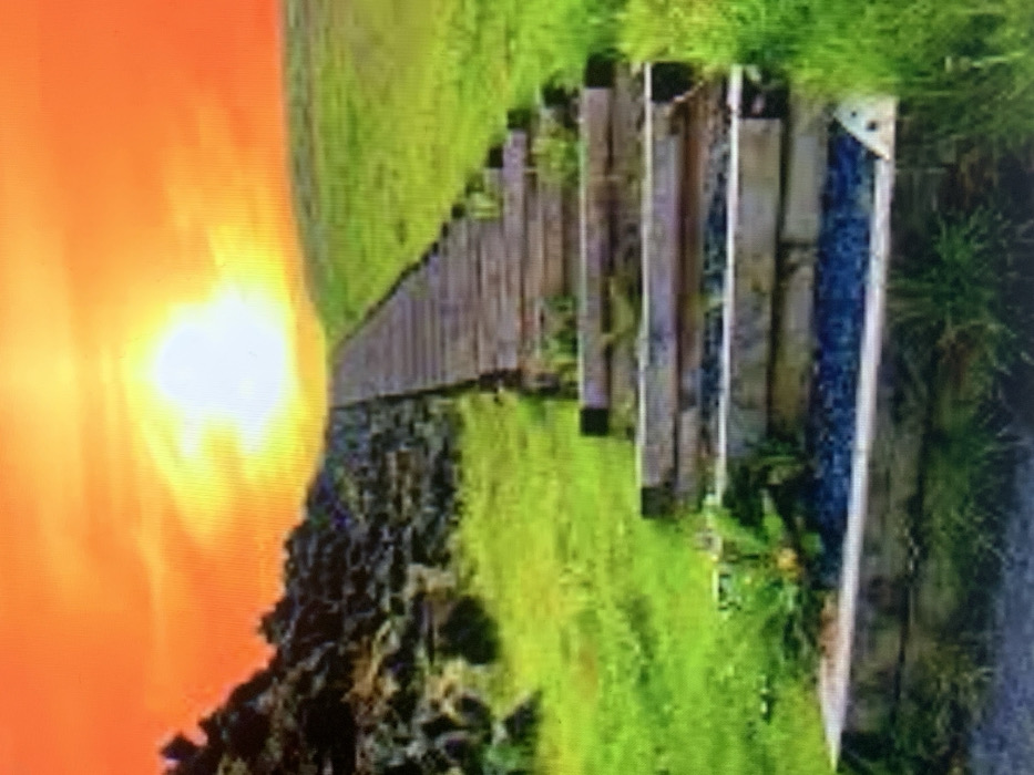 The scene displays a set of ascending outdoor stairs under a brilliant orange-yellow sky, indicative of either sunrise or sunset, situated in Al-Mazza Municipality, Syria. The stairs consist of rough-hewn wooden planks forming risers, with treads filled by dark, compacted material, likely gravel. Sparse green vegetation and weeds are visible along the edges of the steps. To the left, a darker, rugged slope composed of rock formations and minimal plant life ascends parallel to the stairs. To the right, a smooth, verdant grassy hillside rises gently. The dominant light source, a luminous sun, is positioned centrally in the upper frame, casting a strong, warm glow across the landscape. No human figures, animals, or additional man-made objects beyond the stairs are present within the frame.
