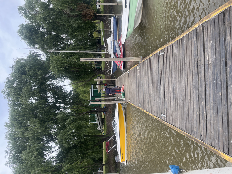 Boats are docked along a wooden pier. A yellow boat is positioned towards the bottom left, with a few other boats including a red and blue one nearby. A person is visible on the pier, near the boats. Lush green trees line the edge of the water, and the sky above appears overcast.