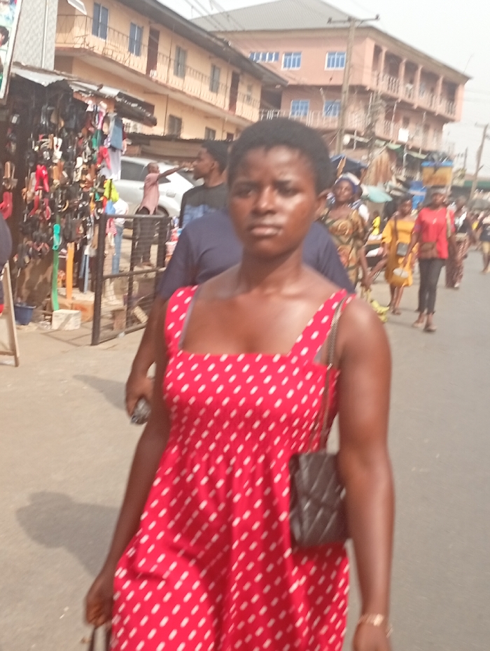 A woman in a red and white polka-dot dress walks on a street bustling with people. She carries a black purse over her shoulder. Behind her are other pedestrians and various buildings. To the left is a stand displaying shoes, and the background shows a busy street scene with shops and passersby. The overall atmosphere indicates a vibrant, crowded urban setting.