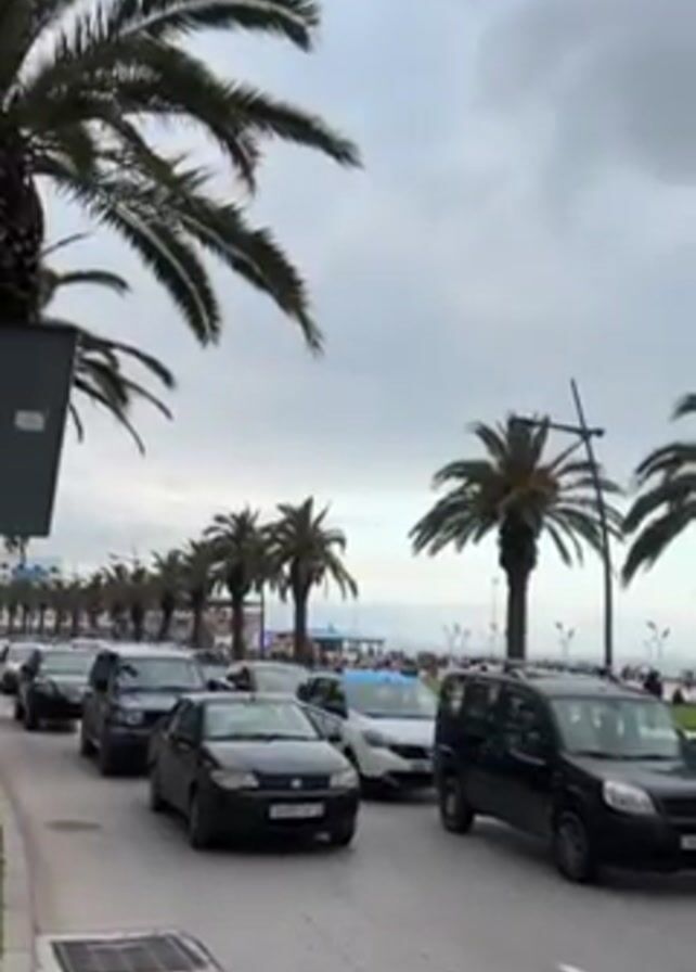 street lined with palm trees on a cloudy day. Cars are moving slowly in traffic along the street, with people visible walking in the background, near the ocean.