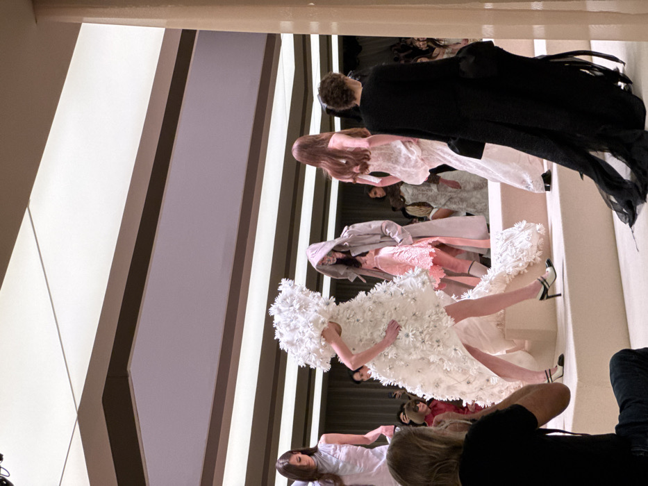 An indoor fashion show is depicted on a multi-tiered, light beige runway, likely taking place in Paris, France. In the immediate foreground on the left, a person with long, light brown hair, wearing a black top and blue jeans, crouches or kneels while holding a camera to their eye, focusing on the runway action. On the runway, multiple individuals, predominantly female models, are showcasing elaborate garments. Central to the frame is a model in an intricate, avant-garde white dress adorned with numerous white floral appliques. The dress features a high-low hem, revealing her legs and two-tone (white and black) high-heeled shoes, and a long, voluminous train trailing behind her. Her head is partially obscured by the dress's high, ruffled collar as she walks. Behind her, another female model wears a long, light beige or pink hooded coat, with a shorter pink garment visible underneath. Further to the right, a third model, seen from the back, has long reddish-brown hair and wears a flowing, light-colored gown with detailed texture and a voluminous rear section. To the far right, a person with short, dark curly hair, also viewed from the back, wears a long, black, flowing garment with wide sleeves and a lengthy train extending onto the runway. In the background, additional models are visible on the runway, dressed in other distinct fashion pieces, including a structured, silvery-grey garment. Audience members are faintly discernible seated along the sides of the runway. The environment is well-lit with integrated linear ceiling lights and recessed panels, creating a clean and modern aesthetic.
