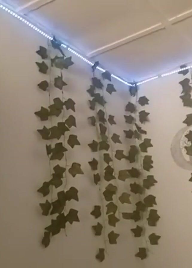 room with white walls, decorated with artificial ivy vines. The vines are attached to the walls and hang down vertically. In the background, there are faded drawings on the wall including a crescent moon and a butterfly in a basket. A red, heart-shaped object is also displayed. Blue LED strip lights are installed along the ceiling. The video zooms out slightly to reveal more of the wall decoration.