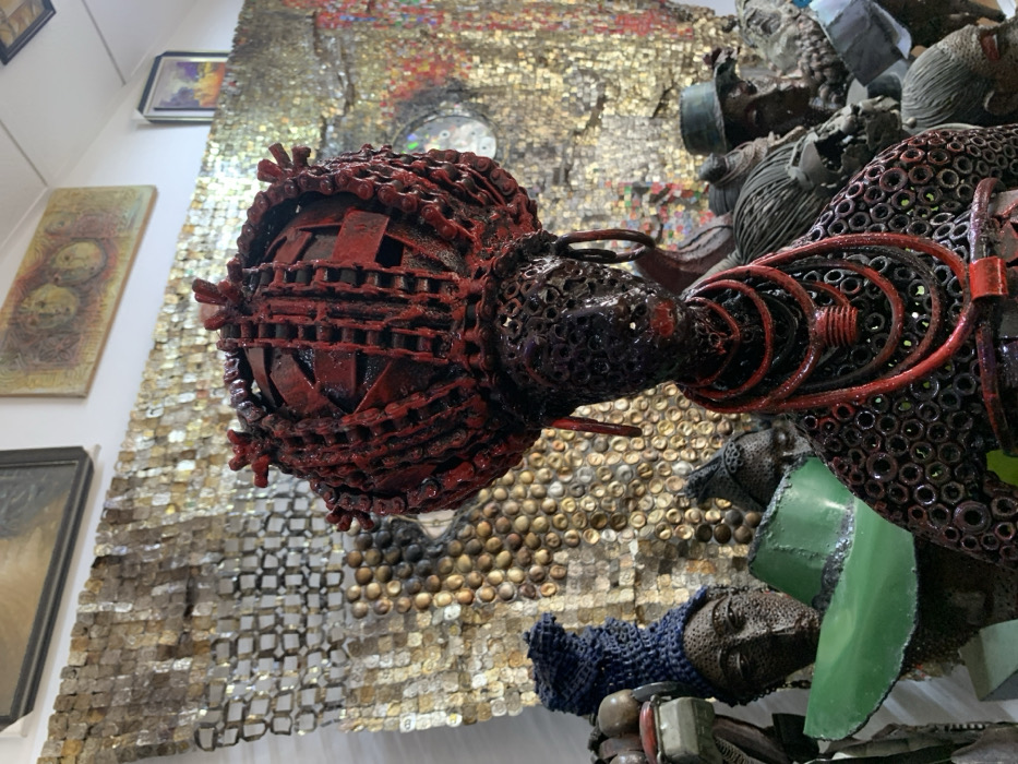 This image depicts an indoor art exhibition or studio setting in Ikate, Nigeria. The central subject is a prominent, dark-toned sculpture of a female bust, constructed from various recycled metal components such as nuts, bolts, and bicycle chains. This central figure wears an elaborate, vibrant red headdress or crown, fashioned from interwoven red-painted chains and other metal pieces. Its body is composed of densely arranged small, dark circular metal elements, with red lips and a multi-strand red necklace featuring a prominent central cylindrical component. To the immediate left and slightly behind the central sculpture, a dark-colored bust with a textured blue head covering is partially visible. Further back, another sculpture head wears a bright green, wide-brimmed metal hat. Several other dark, abstract metal figures and busts are indistinctly visible in the background to the right, also appearing to be made from assembled metal components. The background features a large, textured wall art piece, resembling a mosaic made from numerous small, metallic, reflective elements, possibly bottle caps or metal scraps, displaying a golden-silver hue. Above this, two framed paintings are mounted on a white wall: a darker, possibly abstract piece to the left, and a more colorful, possibly landscape-oriented piece to the right. The lighting is bright and even, suggesting an interior space dedicated to art display.