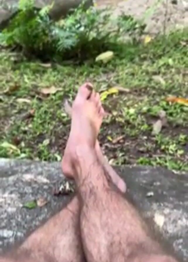 man relaxing outdoors near a stream. The camera focuses on his bare feet and legs, which are hairy, and one knee appears to have a minor scrape or scab. He's sitting on a concrete surface covered in moss. The background reveals a small, shallow stream flowing over rocks. There's green vegetation visible around the stream, including ferns and other plants. The overall scene depicts a peaceful, natural environment.