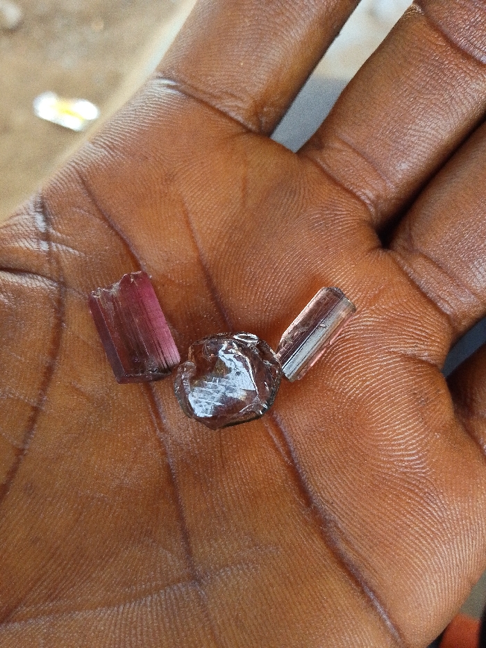 A dark-skinned adult hand is presented palm-up, holding three raw mineral specimens