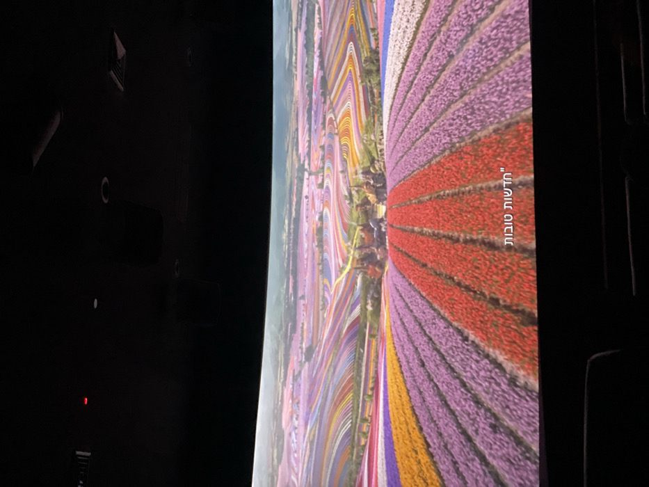 A digital display shows a field of colorful flowers in rows. Predominantly lavender and red tulips create vibrant stripes. A thin strip with a variety of colors runs through the center. Hebrew text appears on the screen, reading "חדשות טובות," which translates to "Good News." A dark, textured wall is visible on the left, while darkness surrounds the display, creating a focused visual experience.