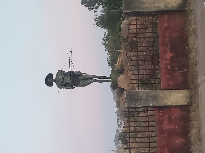 A bronze statue of a figure with a wide-brimmed hat holding a bow and arrows stands atop a rock formation. Behind the statue is a metal fence with a weathered concrete and red wall. The background consists of greenery and distant buildings under a sky. The overall scene has a slightly muted color palette.