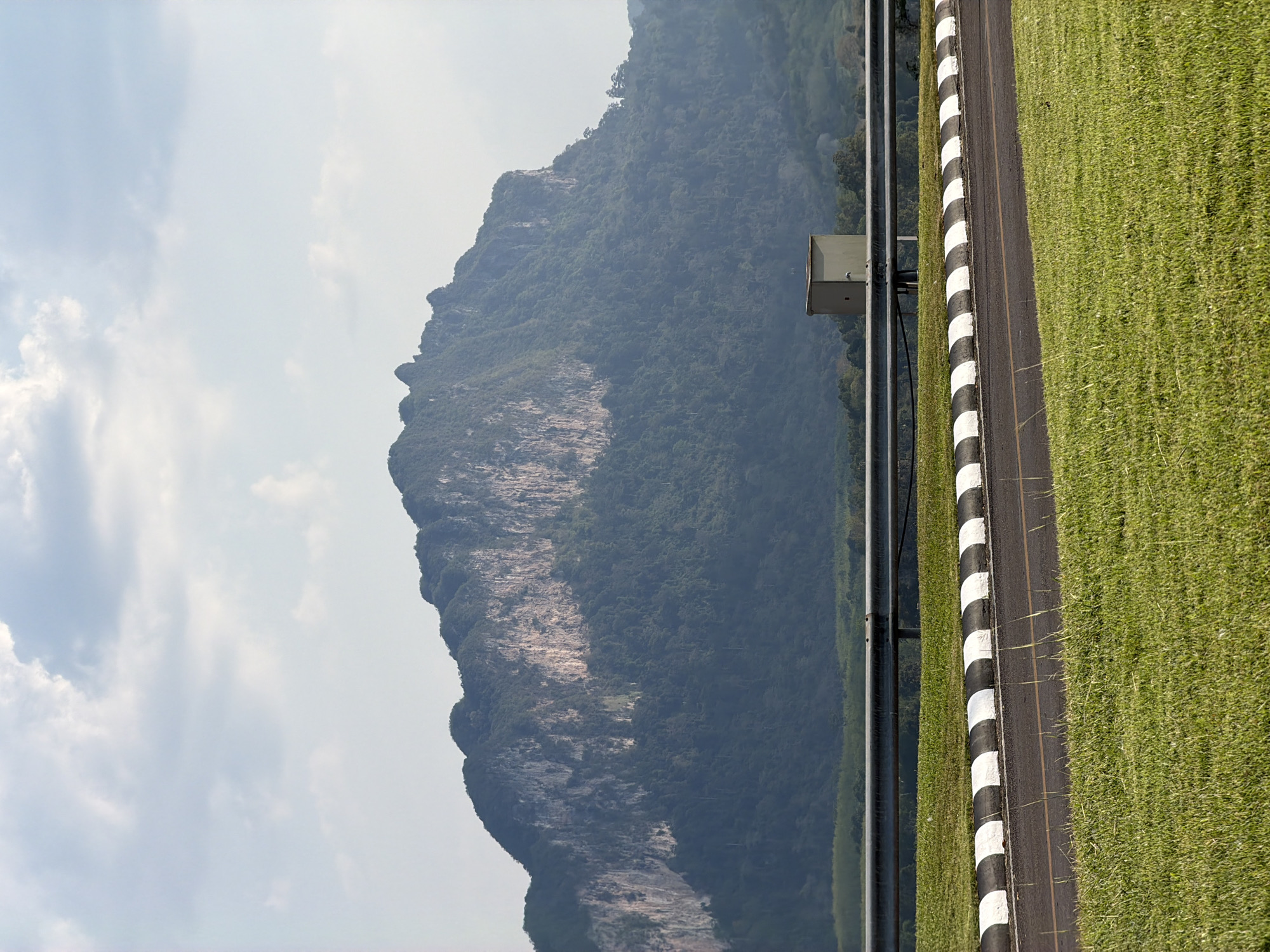 The image depicts a static outdoor scene in the vicinity of Ban Chiao Lan, Thailand, characterized by a prominent mountainous landscape. In the foreground, a strip of green grass extends across the bottom of the frame. Immediately above this, an asphalt road surface is visible, bordered on its right by a black and white striped curb, consisting of alternating painted segments. Behind the curb, another section of green grass slopes gently upwards. A two-bar metal guardrail runs horizontally across the mid-ground, positioned atop this grassy slope. To the right of the image center, situated behind the guardrail on the upper grassy bank, is a light gray, rectangular utility box. The background is dominated by a large, steep, forested mountain range, featuring dark green vegetation and visible vertical rock faces of a lighter, grayish-tan color. The sky above is light blue with scattered white and light gray clouds. No individuals or active subjects are present in the frame.