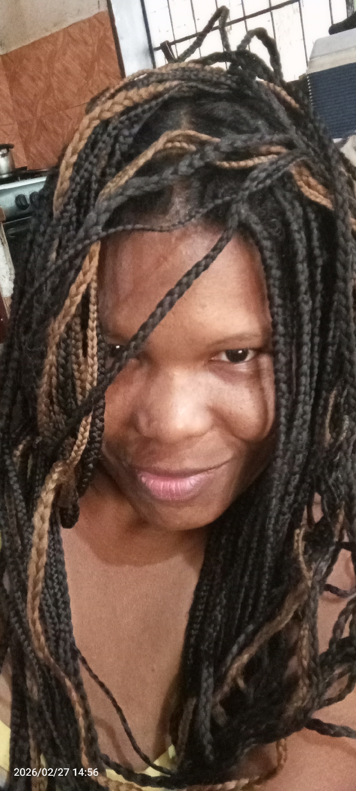 The image depicts a close-up portrait of an adult individual with dark skin, assumed to be located in the city of Altagracia, Venezuela. The subject is centered, looking directly at the camera with a slight, closed-lip smile. Their hair is styled in numerous small braids, predominantly dark brown/black, with interspersed sections of lighter, golden-brown or blonde braids. The braids frame the face and cascade around the shoulders. A light-colored top is visible around the neck and upper chest. The background suggests an indoor domestic environment. To the viewer's left, a silver-toned kitchen appliance, possibly a stove, with black controls and a pot on its surface is partially visible, above which is a reddish-brown textured wall. To the viewer's right, a window or barred opening with a grid pattern is present. A digital timestamp in the lower-left corner reads "2026/02/27 14:56."