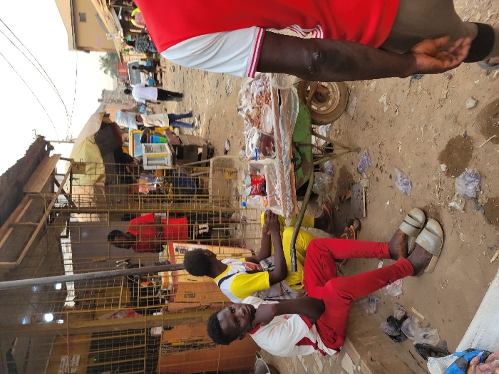 A bustling street scene features vendors and passersby. Two young men sit casually, one in red pants and a white shirt with red sleeves, the other in a yellow shirt. A cart laden with goods stands nearby. Behind them, a caged structure houses individuals. The background shows a street with various people and a yellow auto-rickshaw. Debris litters the ground. A man in a red shirt stands in the foreground, partially obscuring the view.