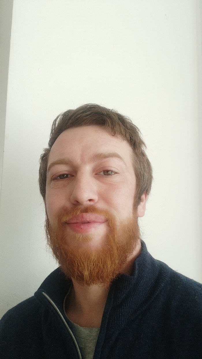 The image displays a head-and-shoulders portrait of an adult male, captured indoors against a plain light-colored wall in Gurkovo, Bulgaria. The subject, possessing fair skin, brown hair, and a reddish-brown full beard, is positioned facing the camera with direct eye contact and a slight smile. A minor red mark is visible on his lower lip. He is dressed in a dark blue zippered jacket, worn partially open to reveal a light grey t-shirt underneath. A vertical structural edge or corner is discernible along the left side of the background.