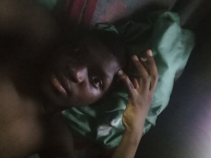 An image, captured in a dimly lit indoor setting within Bauchi, Nigeria, presents a close-up, slightly upward-angled view of an individual. The person, with dark skin, is lying in a reclined position, looking directly towards the camera. Their face, including brown eyes and a slightly parted mouth, is centrally framed. A right arm is bent, with the hand resting against the right side of the face/temple area. The individual is partially covered by a rumpled green fabric, likely clothing or bedding, with a portion of a red, green, and dark striped or checkered fabric visible beneath it. The background is predominantly dark, with a subtle light flare in the upper left quadrant.