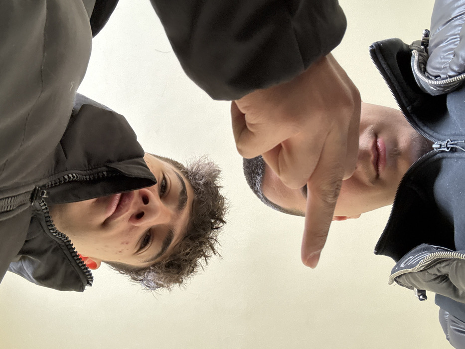 The image presents a low-angle perspective of two males situated against a uniform, light off-white background, indicative of an indoor setting. No specific environmental markers are visible to determine a precise location within Blagoevgrad, Bulgaria. The individual occupying the upper portion of the frame is inverted relative to the camera's orientation. This subject is a young male with dark, curly hair showing traces of a lighter, possibly purple or silver, tint. His facial features, including eyes, nose, and mouth, are visible, along with minor skin blemishes on the forehead. He displays a slight smile and is wearing a dark, possibly black, puffer-style jacket with a zippered closure. The individual in the lower portion of the frame is oriented upright. This subject is male, with dark, closely-cropped hair. The upper half of his face, including his eyes and nose, is obscured by his right hand, which is raised with the middle finger extended upwards. His mouth is closed, exhibiting a neutral expression, and a small soul patch is visible on his chin. He is also wearing a dark, possibly black, puffer-style jacket, similar in appearance to the other individual's garment, featuring a zippered front. The scene captures an interaction where one subject makes a common offensive gesture directed towards the camera or viewer, while the other subject observes.