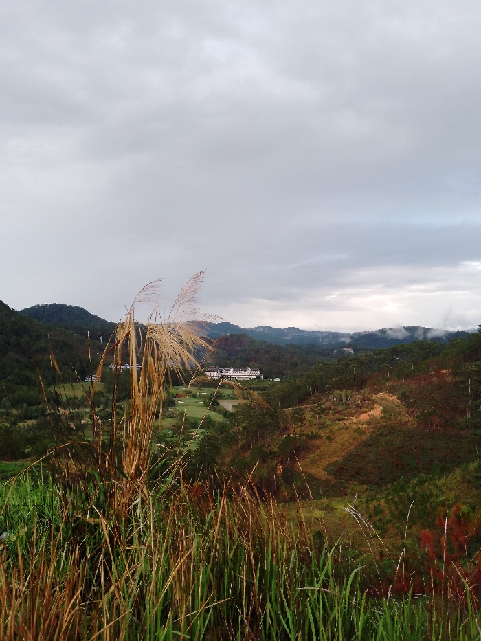 The image displays a panoramic landscape captured in Xuân Thành, Vietnam, featuring a valley with a golf course and resort complex under an overcast sky. In the immediate foreground, tall, dry, straw-colored grasses and reeds stand prominently, along with patches of green foliage and some reddish-brown vegetation on a slight incline. The midground reveals a manicured golf course with several green fairways and a small body of water, likely a pond, adjacent to a large, multi-story white building with a distinctive, complex roofline. This structure appears to be a resort or hotel. Another, smaller building is partially visible to the left of the main complex. Beyond the golf course and buildings, the scene is dominated by a series of densely forested hills and mountains that recede into the distance. The slopes are covered in dark green trees, with some areas exhibiting lighter, possibly disturbed or deforested patches. The sky overhead is heavily overcast with a uniform layer of light and dark grey clouds, indicating a subdued natural light condition. There are no discernible people, animals, vehicles, or explicit actions/interactions depicted within the frame.