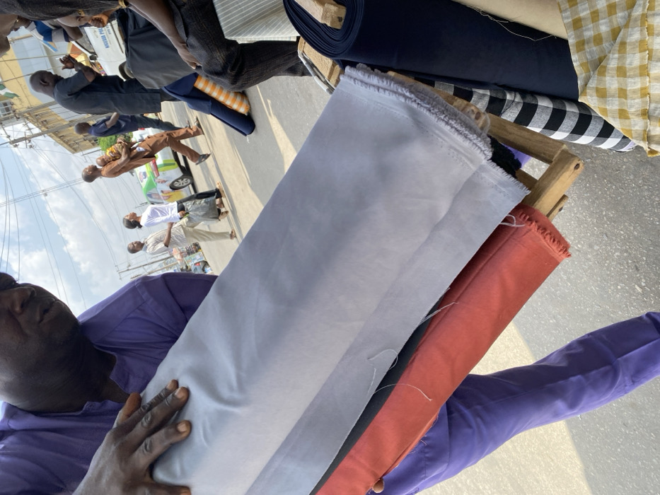 A close-up, low-angle photograph depicts a busy outdoor market street in Ibadan, Nigeria, under a bright, cloudy sky with overhead power lines. In the immediate foreground, a dark-skinned individual wearing a purple traditional long-sleeved top and trousers holds three large rolls of fabric horizontally. The rolls are stacked, with a light gray roll on top, a black roll in the middle, and a reddish-orange roll at the bottom; all display raw, fringed edges. To the right, additional fabric rolls are visible on a wooden stand, including dark blue, black-and-white checkered, and yellow-and-white checkered patterns. The background reveals a bustling street scene with multiple pedestrians on paved ground. Visible figures include a man in a light-colored shirt walking left, a woman in a white long-sleeved top carrying a dark bag behind him, and a man in a brown traditional outfit walking right while holding a baby dressed in orange. Further right, another man in dark traditional attire stands, appearing to gesture. Vehicles are present; a light-colored vehicle with colorful decals is in the mid-ground, and "NIGERIA POLICE" is partially legible on a white vehicle to the right. Buildings line the street in the distance.