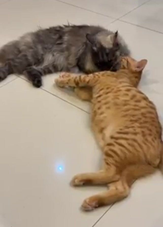 Two cats are lying on a white tiled floor. One cat is gray and fluffy, and it is licking the head of an orange tabby cat that is lying next to it. A small blue dot is visible on the floor near the orange tabby cat.