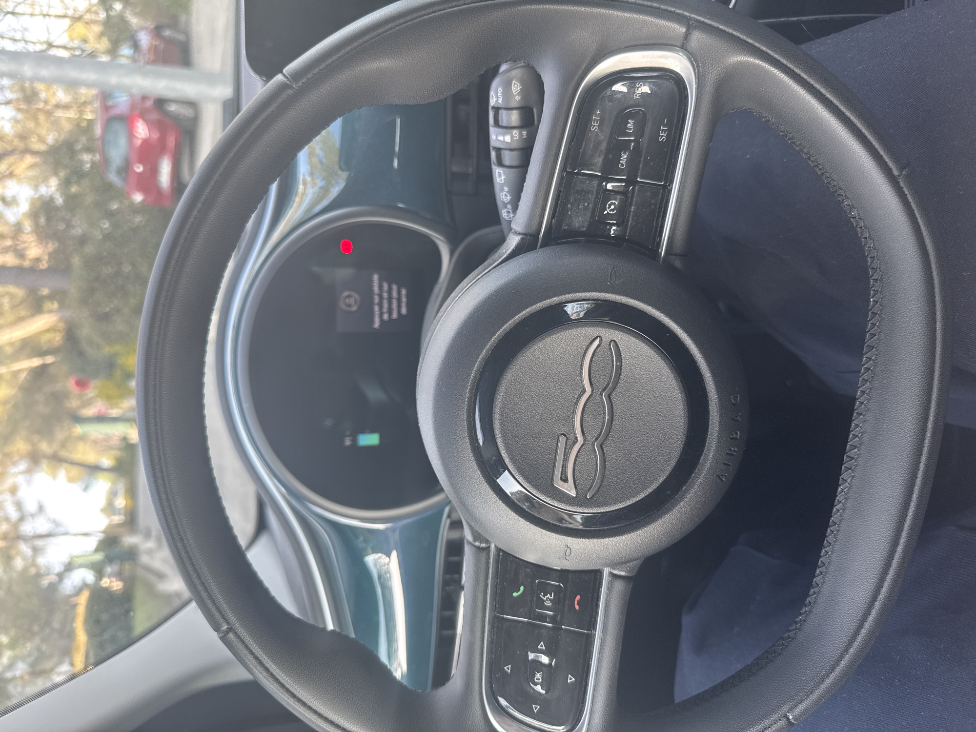 The image depicts the interior of a Fiat 500 vehicle from the driver's perspective, located on a street or parking area in Valbonne, France. The central focus is the black leather-wrapped multi-function steering wheel, featuring a chrome "FIAT 500" emblem on the airbag cover, with "AIRBAG" text visible below. The left spoke of the steering wheel includes directional buttons, an "OK" button, and telephone control buttons (answer, hang up, voice command). The right spoke contains buttons for cruise control: "SET+", "CANC," "LIM," "RES," and "SET-." Behind the steering wheel, the vehicle's dashboard is visible, characterized by a teal-colored panel. The digital instrument cluster displays a green battery charge indicator and a prominent red warning light, accompanied by partially visible French text. A wiper control stalk, positioned to the right of the steering column, is set to "AUTO" with "LO" and "HI" options visible. Below the steering wheel, the driver's legs are visible, clothed in dark blue fabric trousers. Through the blurred windshield, an outdoor environment is discernible, consistent with a daytime street scene. Trees line the background, and a red small hatchback vehicle is partially visible, either parked or in motion, in the distance on the right side of the frame.
