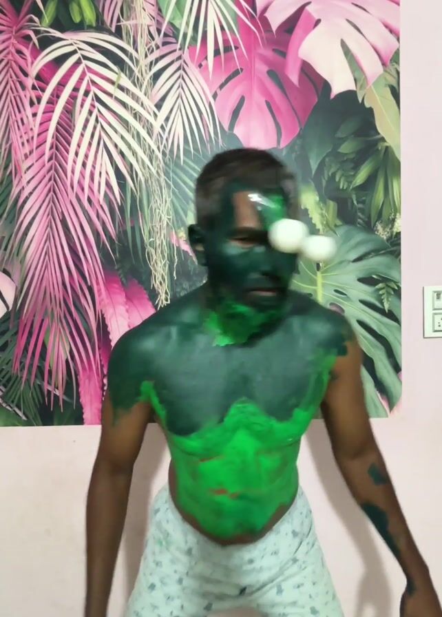 A medium shot captures a man from the chest up, his face and chest covered in dark green paint, dancing against a backdrop of a colorful leafy print. He is wearing light-colored patterned shorts. Two ping pong balls are stuck to his face, one on each side. The lighting is standard interior lighting. The man moves with the music, creating a comical and slightly bizarre scene.